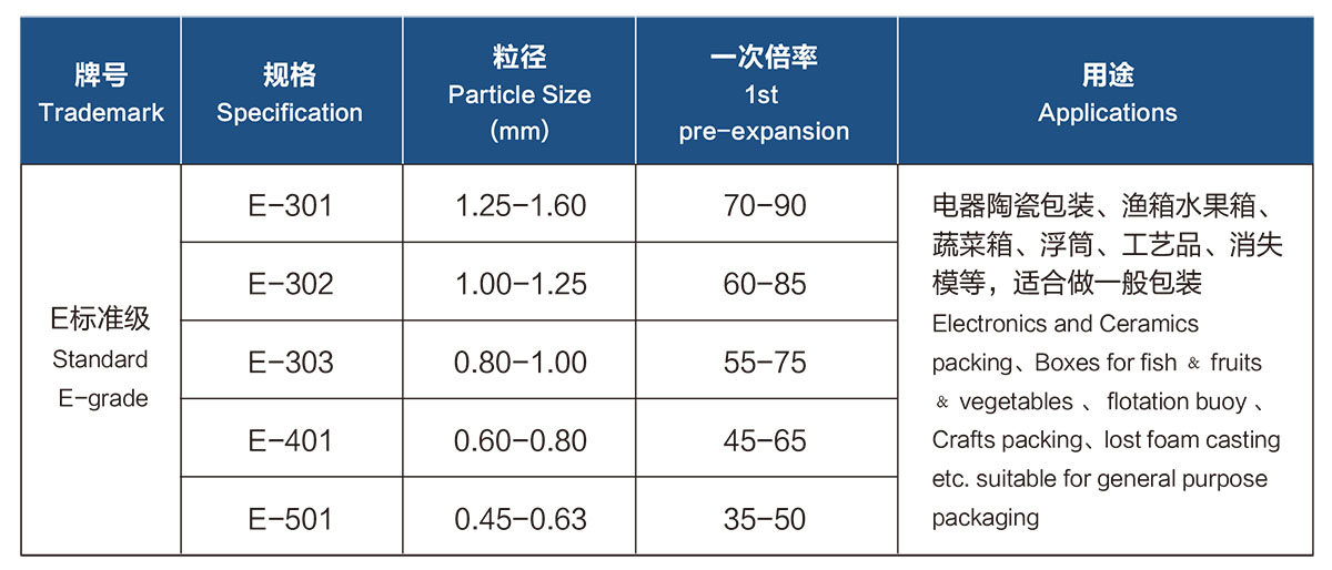 E-標(biāo)準(zhǔn)料是廣泛應(yīng)用的普通型EPS,適用于自動(dòng)真空成型機(jī)、傳統(tǒng)升降式液壓機(jī)。屬標(biāo)準(zhǔn)發(fā)泡倍率原料,可一次發(fā)泡達(dá)到較輕克重泡粒,也可多次發(fā)泡獲得更輕的泡塑制品,一般較適宜應(yīng)用于一次發(fā)泡13克/升以上的制品,廣泛適用于機(jī)電產(chǎn)品包裝,土木建筑用保溫隔熱材料,漁用浮球筒,工藝品,裝飾裝潢建材,鑄件消失模等。